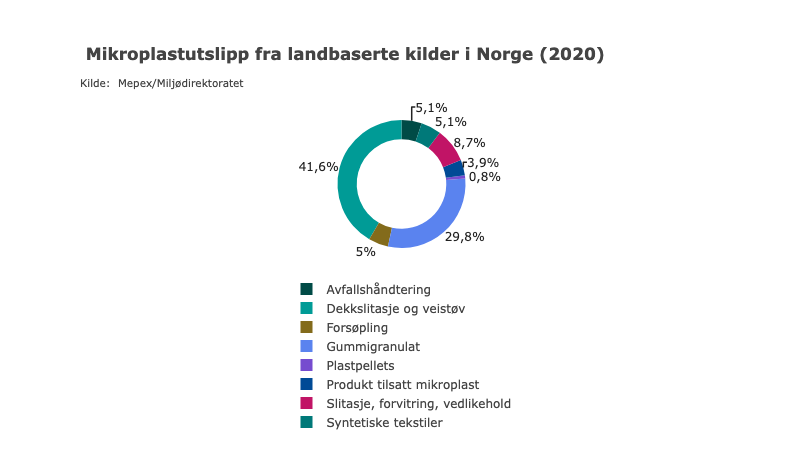 Mikroplast Publisert 01. oktober 2025 Innholdsfortegnelse De fleste vet at plast er farlig for miljøet. Dette er blant annet fordi plast ikke brytes ned på samme måte som andre produkter, men deles heller i mindre og mindre biter vi bedre kjenner til som mikroplast. Mikroplast er rett og slett veldig små deler av plast. De er på en størrelse mellom 0,001 og 5 millimeter. Til sammenligning er et typisk sandkorn mellom 0,06 og 2 millimeter i diameter. Mikroplast blir laget ved at store plastbiter blir brutt ned til mindre biter grunnet tid, slitasje, stråling og vær, eller ved at industrien lager produkter som allerede inneholder små biter plast. Mikroplast er nesten umulig å fjerne fra naturen. Hvert år slippes det ut nok mikroplast i Europa til å fylle mellom 200 og 600 olympiske svømmebassenger – helt utilsiktet. EU-kommisjonen i samarbeid med REACH satt i 2023 et mål om å redusere mikroplastutslipp med 30% innen 2030. Dette har de tenkt til å oppnå ved å forby salg av mikroplast, produkter som med vilje er tilsatt mikroplast, og produkter som frigjør mikroplast når den brukes. Det har hittil blitt holdt fem (2025) forhandlinger om en global plastavtale gjennom FN uten en konklusjon. Her har landene som er med, prøvd å komme til enighet om fremtiden til verdens plastbruk. Kilder til mikroplast De vanligste måtene vi blir utsatt for mikroplast på, er gjennom kosmetikk, medisiner og klær, i tillegg til forsøpling. Mikroplast blir blant annet direkte framstilt i kosmetiske produkter og legemidler. Det blir også sluppet ut hver gang vi vasker klær av syntetiske fibre. Forskere antar at mennesker får i seg mellom 0,1 til 5 gram mikroplast i uken. 5 gram er tilsvarende vekten til et bankkort! Syntetiske tekstiler er tekstiler laget av olje og utgjør mer enn 60% av dagens tekstilproduksjon. Treningsklær, kjøkkenkluter av mikrofiber, og fleece er tekstiler av syntetiske fibre mange av oss bruker til vanlig. Ifølge Miljødirektoratet, er det anslått at det årlige utslippet av mikroplast fra tekstiler i Norge er på omtrent 1000 tonn. Disse tekstilene slipper ut mikrofiber ved slitasje og hver gang vi vasker dem. Klær og tekstiler laget av naturlige fibre (som bomull) avgir også mikrofiber ved slitasje og vask, men disse er nedbrytbare. Mikroplastforurensning kommer også fra kosmetikk. Dette kan se ut som små pellets i kroppspeeling eller plastbiter i tannkrem. I Norge anslår vi at det slippes ut omtrent 90 tonn mikroplast fra kosmetikk hvert år. EUs forbud mot tilsatt mikroplast i kosmetikk trådte i kraft i 2023, og mange produkter er nå i ferd med å fases ut eller er allerede mikroplastfrie. I Norge kan du forsikre deg om at produktene du kjøper er mikroplastfrie ved å se etter svanemerket. Noen tannkremer og annen kosmetikk inneholder mikroplast for en polerende effekt. Dette fases ut nå.Illustrasjon: UngKlima ved Aleksandra Cieplak Kunstgressbaner og gummigranulat er Norges nest største kilde til mikroplastforurensing. Gummigranulat er laget av gamle bildekk, og det betyr dessverre at det kan inneholde mange farlige kjemikalier. Tall fra 2020 viser at cirka 6% av granulatet på kunstgressbaner ender opp utenfor banens område. Fra 2031 vil salg av gummigranulat være forbudt i EU. Dette betyr at kunstgressbaner må erstatte gummigranulat med et mer miljøvennlig fyllmateriale når reguleringen trer i kraft. Slitasje fra bildekk regnes som den største kilden til mikroplastforurensning på land, og står for hele 40% av utslippene. Bildekk avgir mikroplast ved at dekkene slipes mot veibanen og friksjonen avgir deler fra bildekket til veikanten. Små ting som å justere lufttrykket på bildekkene kan minke slitasjen og bidra til mindre utslipp. En oversikt over hvor stor andel de landbaserte utslippene utgjør i Norge.Figur: Mepex/Miljødirektoratet (Hentet 10.10.2025) Det finnes selvfølgelig mange flere kilder til mikroplast som forsøpling, fiskeriutstyr, maling, og lakk fra båter. Forsøpling bidrar med ca. 1000 tonn mikroplastutslipp hvert år i Norge. Fiskeriutstyr er også en stor kilde til mikroplast når det gjelder sjøbaserte utslipp, hvor tap av slikt utstyr er en av de største kildene til plastforurensning i norske havområder. I tillegg bidrar maling og lakk fra båter til mikroplastutslipp ved slitasje av bygninger og skip i form av små plastpartikler. Hvorfor er mikroplast farlig? Forskere vet fremdeles ikke alle effektene av å ha mikroplast i og rundt oss. Vi får i oss mikroplast gjennom maten vi spiser, luften vi puster og vannet vi drikker uten at vi egentlig er klare over det. Det er flere helseeffekter som blir undersøkt, blant annet endrede reproduksjonsevner, lungesykdommer og kreft. Plast har egenskapen til å tiltrekke seg farlige kjemikalier og miljøgifter, noe som gjør det enda farligere for organismer å få i seg slik mikroplast. Mange av kjemikaliene som er brukt til produksjon er også direkte koblet til flere sykdommer. Mikroplast kan være veldig farlig for oss, men det er også veldig farlig for natur og dyreliv. I tillegg til at mikroplasten dyr får i seg er full av kjemikaler, så klarer ikke dyr å skille mellom plast og mat, og kan gi dem en falsk metthetsfølelse uten å tilføre noe næring. Dette kan også ha konsekvenser høyere opp i næringskjeden grunnet biomagnifisering av de farlige kjemikaliene som befinner seg i plast. Biomagnifisering er når konsentrasjonen av farlige stoffer blir høyere hos dyr høyere opp i næringskjeden siden det de spiser også har fått i seg miljøgifter. Dette kan gjelde oss mennesker når vi spiser fisk som har spist plankton og fått i seg mikroplast og andre farlige kjemikalier. Veien fremover Det er mange organisasjoner som jobber med å utforme lover og regler som skal stramme inn plastforbruket. EU-kommisjonen og REACH jobber for å redusere mikroplastutslipp med 30%. WWF jobber med å øke prisen på plast slik at den blir mindre utbredt. Gjennom FN, ska